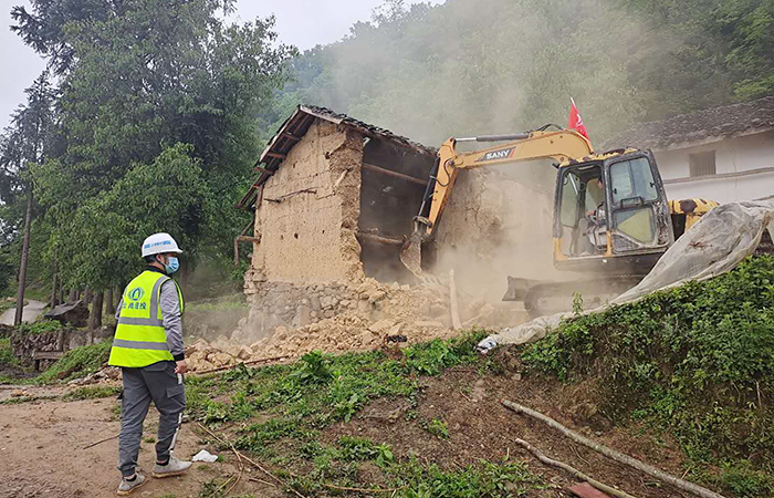 5月19日上午,項目部全體人員對項目進行隱患排查,在確保項目安全無隱患后。下午1時按災(zāi)后救援指揮部的部署,項目經(jīng)理熊世南帶領(lǐng)11名管理人員奔赴位于大山深處的新店鎮(zhèn),分成四個小隊挨家挨戶排查村民住房受損情況,評估危房風(fēng)險,幫助村民搬離危房,減少后續(xù)余震造成的二次傷害。在經(jīng)過三天的山路輾轉(zhuǎn)跋涉后隊員們拖著疲憊的身軀完成了所負責(zé)區(qū)域的全部排查工作,共計進行危房評估82戶576間、建筑面積達16895平方米。