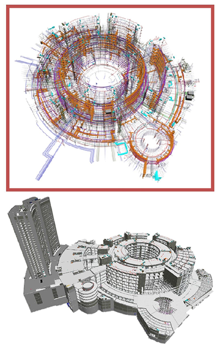 車行天下汽車城(二期)項目開工前組建BIM團隊,根據(jù)項目建筑形狀為圓形及弧形,場地條件及結(jié)構(gòu)豎向極其復雜,項目建筑體量大,總建筑面積約43.34萬平方米,結(jié)構(gòu)復雜等特點,和各專業(yè)工程間產(chǎn)生的碰撞多,單層面積大,施工工藝復雜等難點。先后運用BIM技術解決面臨的重難點問題,如利用模板支撐體系、外腳手架、三維場部等軟件,提高質(zhì)量,減少安全隱患。利用BIM 技術數(shù)據(jù)集成分析,減少現(xiàn)場返工,通過對本項目工程設計、土建施工、機電施工、鋼結(jié)構(gòu)施工等各專業(yè)BIM的集成運用,圖紙問題核查杜絕了因圖紙原因?qū)е碌姆倒?,降低了材料成本、人工成本、機械成本、工期成本。