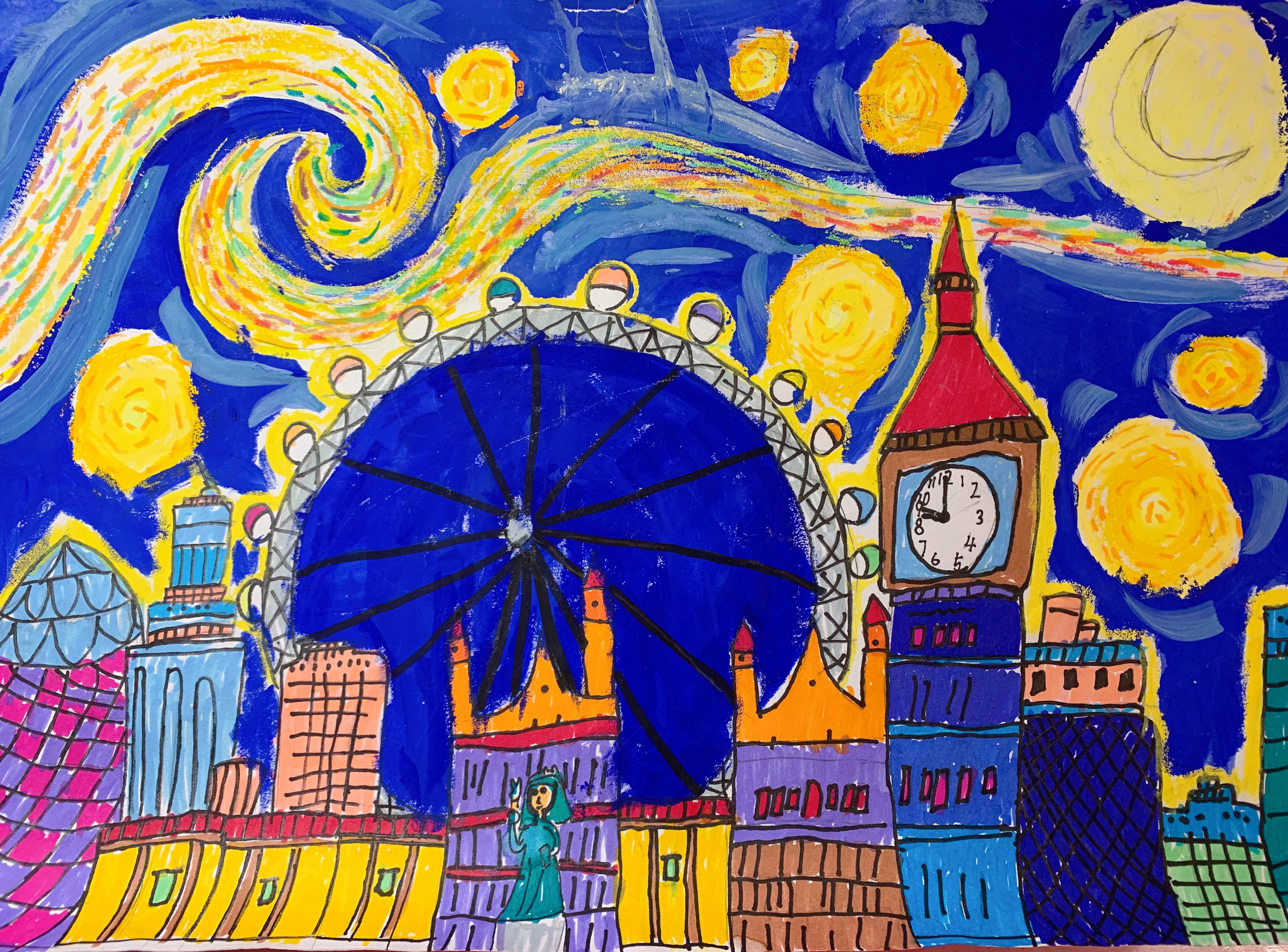 寓意:此畫是小作者根據(jù)梵高的《星月夜》所創(chuàng)。小作者通過(guò)《星月夜》得到靈感,用了漸變藍(lán)色系的月光色和彩虹般絢爛的煙花,明亮的月光,還有照耀世界的自由女神像,明亮又充滿人間煙火氣的溫暖的樓宇和房屋,還有小作者喜歡的彩色摩天輪勾畫了屬于她心中美好的《城市月夜》。雖然不同的人面對(duì)梵高的《星月夜》這幅曠世之作會(huì)有不同的理解,雖然誰(shuí)也無(wú)法弄清楚梵高真正的創(chuàng)作意圖,但是他帶給我們對(duì)繪畫表現(xiàn)手法的探索與執(zhí)著,給予了我們無(wú)限的思索和啟迪。