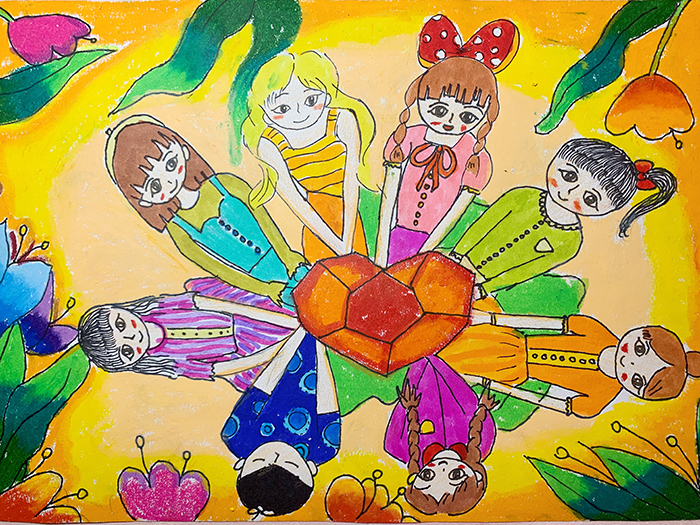 寓意:此畫作創(chuàng)作了我愛(ài)我的祖國(guó),祖國(guó)加油!我們是祖國(guó)未來(lái)的花朵,我們是七彩少年,畫中我們共同手捧愛(ài)心,那是我親愛(ài)的祖國(guó)——中國(guó),我們齊心協(xié)力,眾志成城,我們同在一片藍(lán)天,懷著同一顆熱愛(ài)祖國(guó)的心,我們會(huì)用我們勤勞的雙手共建我們美麗富饒的中國(guó),我們都愛(ài)我們的祖國(guó),我以祖國(guó)為榮。