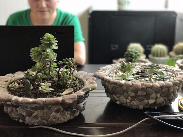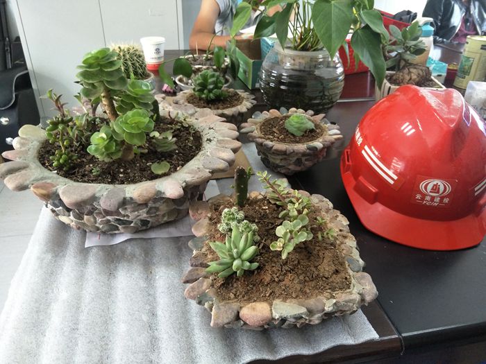 技術(shù)支持: 方森科技 今天晚飯時(shí)經(jīng)過(guò)材料室,無(wú)意間發(fā)現(xiàn)袁老師傅和小尤拿著一桶小石子和小半袋水泥在那搗鼓著什么,仔細(xì)一看,眼前的一幕讓我眼前一亮,只見他們一人拿著小鏟子兌著水?dāng)嚢杷?,一人在塑料盒周圍擺上小石子,不一會(huì)兒的功夫,一個(gè)個(gè)漂亮的小花盆閃亮登場(chǎng)啦。別說(shuō),這用塑料盒、水泥和小石子做出來(lái)的花盆還真是漂亮,再放上泥土,種上多肉植物,擺放在辦公桌上,真是這繁忙的項(xiàng)目駐地處里的“一股清流”啊。細(xì)問(wèn)才知道,原來(lái),這些漂亮花盆的材料都是“原生態(tài)”來(lái)的,塑料盒是吃完洗干凈的塑料飯盒,水泥是他們?cè)谒嘬囆敦浀臅r(shí)候掃下來(lái)的水泥渣,就連小石子也都是從澄江邊上撿回來(lái)的。利用這些材料,袁老師傅和小尤親手“打造”出了辦公室里的一道靚麗的風(fēng)景。