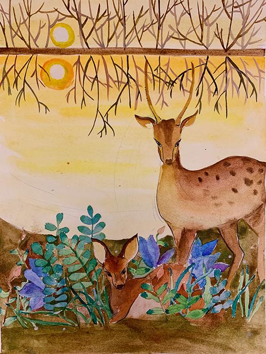 寓意:此畫旨在倡導(dǎo)人與自然和諧發(fā)展、和諧共生、保護(hù)動物、保護(hù)生物多樣性。小作者用自己手中的畫筆將心中對小鹿的喜愛,對動物生命的崇敬,描繪了夕陽下綠草叢蔭中兩只麋鹿安詳?shù)臈⒌氐奈喇嬅?。通過鹿的棲息地體會到小作者內(nèi)心的溫暖,用畫作來感悟生命,以藝術(shù)呵護(hù)生命,以真情來倡議大家保護(hù)動物,參與到生命共同體的保護(hù)行列中。