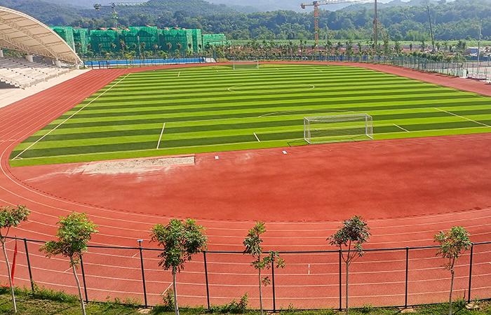 熱帶雨林的螞蟻也很熱情,剛進場時,測量員在茂密的草叢穿梭找點,晚上下班回來時能擦完一整瓶藥膏。后來,在20多臺機械和100多名管理人員及工人的奮戰(zhàn)下,茂密的草叢變成一條條明亮的道路。看,已經到了運動健兒們最喜歡的地方,國際運動比賽水平的400米足球場,硅膠籃球場,為這個新建的校區(qū)增添了勃勃生機。