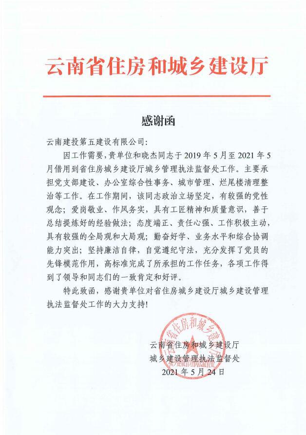 近日,公司收到云南省住房和城鄉(xiāng)建設(shè)廳感謝函,感謝公司職工和曉杰在借調(diào)其城鄉(xiāng)管理執(zhí)法監(jiān)督處工作期間的優(yōu)異表現(xiàn)。和曉杰在工作期間認(rèn)真負(fù)責(zé),高標(biāo)準(zhǔn)完成了所承擔(dān)的工作任務(wù),得到了領(lǐng)導(dǎo)和同志們的一致肯定和好評(píng)。
