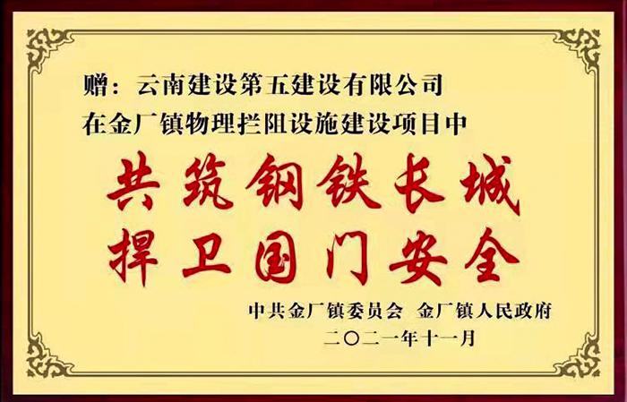 “共筑鋼鐵長城 捍衛(wèi)國門安全”,金廠鎮(zhèn)對公司在金廠鎮(zhèn)物理阻攔設(shè)施項(xiàng)目建設(shè)中同心同向、共克時艱、迎難而上的付出表示誠摯感謝。