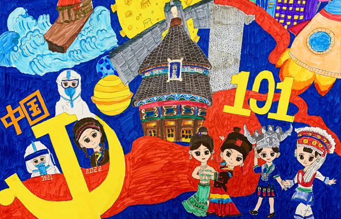 寓意:此畫(huà)旨在倡導(dǎo)我們要從小“知黨恩、聽(tīng)黨話、跟黨走”,自覺(jué)踐行社會(huì)主義核心價(jià)值觀,弘揚(yáng)“紅船精神”,為實(shí)現(xiàn)中華民族偉大復(fù)興的中國(guó)夢(mèng)而努力奮斗。小作者用自己手中的畫(huà)筆將心中對(duì)祖國(guó)的熱愛(ài)與崇敬,對(duì)黨的信仰,通過(guò)繪畫(huà)Q版的少數(shù)民族來(lái)表達(dá)56個(gè)民族一家親,表達(dá)中國(guó)人民的團(tuán)結(jié)奮進(jìn),還有我們的抗疫英雄,北京的歷史宮殿祈年殿來(lái)表達(dá)我們偉大祖國(guó)的歷史文化底蘊(yùn),通過(guò)繪畫(huà)現(xiàn)代高樓、月球、火箭等表達(dá)祖國(guó)現(xiàn)今的飛速發(fā)展和實(shí)力,輕輕飛舞的紅絲帶、黨徽、紅船,沉甸甸的展現(xiàn)出我們的百年大黨,提醒我們不忘初心 砥礪奮進(jìn)。通過(guò)“喜迎二十大、永遠(yuǎn)跟黨走、奮進(jìn)新征程、爭(zhēng)做好少年”,體會(huì)到小作者愛(ài)國(guó)愛(ài)黨愛(ài)社會(huì)主義,胸懷祖國(guó),爭(zhēng)當(dāng)好少年,最美的信仰在心中。用畫(huà)作來(lái)感悟偉大祖國(guó)的巨變,為生為中國(guó)人而感到驕傲和自豪,傳達(dá)愛(ài)國(guó)情懷。