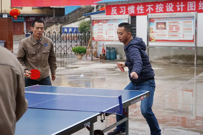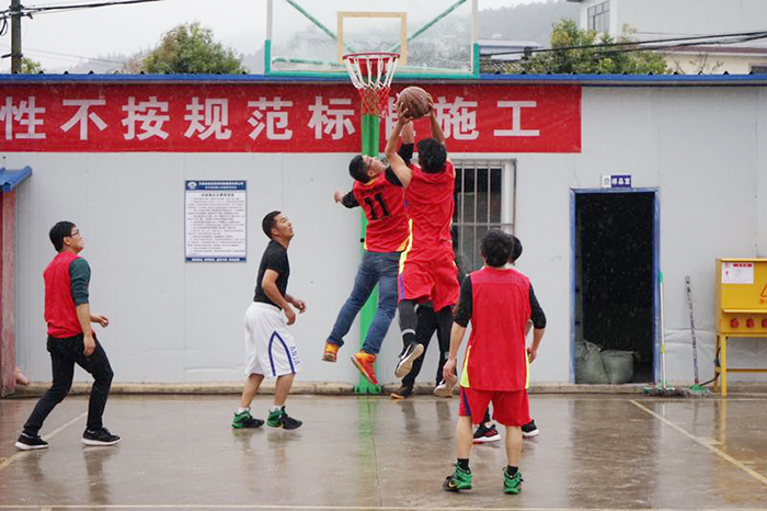 乒乓球雙打比賽運動員們凝神屏氣,一決高下;籃球賽上運動員們盡情展現(xiàn),觀眾們歡呼聲不斷;“兩人三足”接力賽更是趣味橫生,每組隊伍派出4對選手以男左女右腳捆綁進行接力賽,運動員們并肩前進奔跑,時不時出現(xiàn)的雙腳和身體不協(xié)調(diào)的滑稽樣子引來大家開懷大笑;拔河比賽將運動會的氣氛推向了高潮:各參賽隊比賽前圍成一個圈低聲探討獲勝“天機”;賽前隊員們都摩拳擦掌鼓足了勁兒,隨著裁判的哨子吹響,場上的加油聲一陣高過一陣。天氣雖有點灰蒙蒙,但是大家的熱情很高漲,項目部上空時不時傳來大家的歡聲笑語,好一派熱鬧的場景!