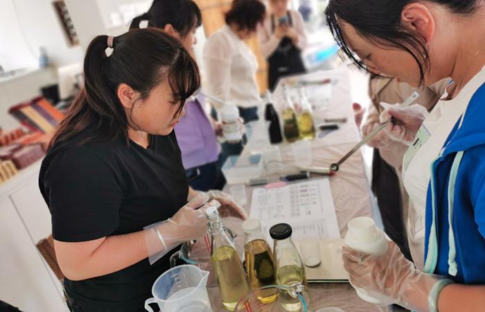 在專(zhuān)業(yè)芳香師的指導(dǎo)下,參加活動(dòng)的職工兩人一組、通力配合,在掌握精確的溫度和重量后,大家在量杯中有序地加入各種原料和自己喜歡的精油,通過(guò)持續(xù)攪拌,神奇的化學(xué)反應(yīng)給大家?guī)?lái)了驚喜,皂液倒入模具后呈現(xiàn)的各種形狀也讓人賞心悅目。