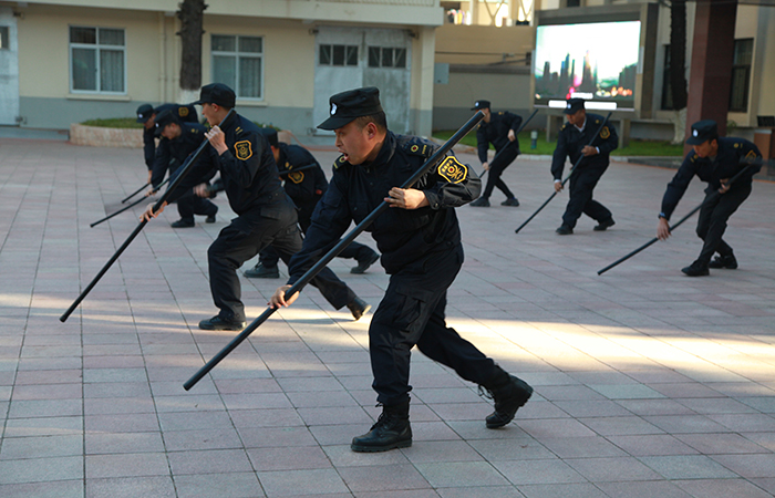 此次培訓自1月10日開始,1月23日結束。隊列訓練之后,護衛(wèi)隊們抖擻精神,展開劈棍、蓋棍、戳棍、挑棍、架棍、檔棍、格棍的應急棍術訓練,“挑棍腳步要上前,姿勢要放低”教練員認真指導動作,護衛(wèi)隊員們聚精會神學習,一次又一次反復練習,直至動作達到標準要求。