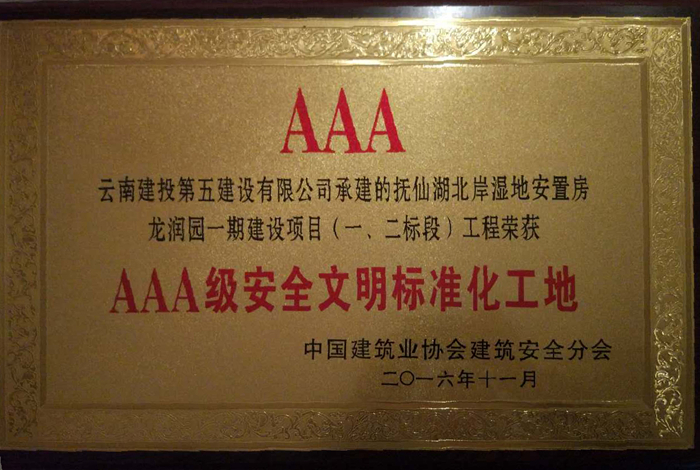 技術(shù)支持: 方森科技 11月29日,2016年中國(guó)建筑業(yè)協(xié)會(huì)建筑安全分會(huì)年會(huì)暨理事會(huì)在安徽合肥舉行,由第三直管項(xiàng)目部施工的撫仙湖北岸濕地安置房龍潤(rùn)園一期建設(shè)項(xiàng)目(一、二標(biāo)段)獲2016年“AAA級(jí)安全文明標(biāo)準(zhǔn)化工地”稱(chēng)號(hào)。