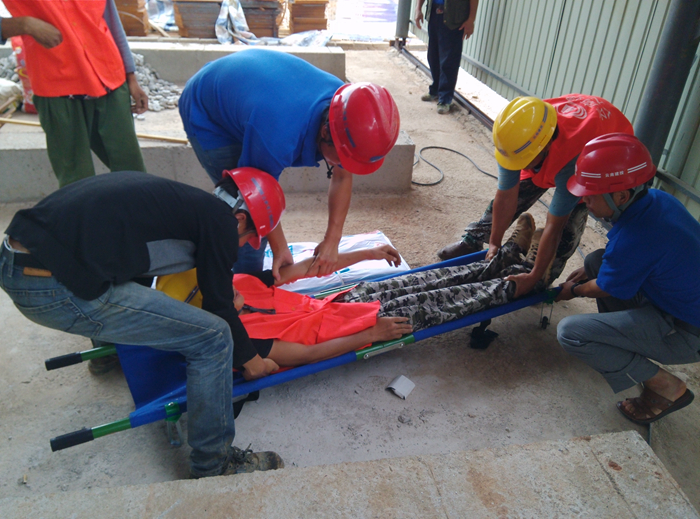 項目部模擬了電工在預制場內梳理電線時,由于電源線絕緣層破損漏電造成觸電的事故現(xiàn)場。演練中,現(xiàn)場作業(yè)人員在發(fā)現(xiàn)事故后,立即向現(xiàn)場負責人報告,接到報告后現(xiàn)場負責人馬上匯報項目負責人,項目負責人立即啟動觸電事故應急救援程序,組織人員對觸電者進行急救,并向當?shù)蒯t(yī)院請求救援,由于觸電者“傷勢嚴重”,醫(yī)院救護車輛仍未到達,應急救援指揮長馬上組織人員將傷者移至應急救援車輛上并出發(fā),在應急救護小組成員的陪同下與醫(yī)院救護車接頭。