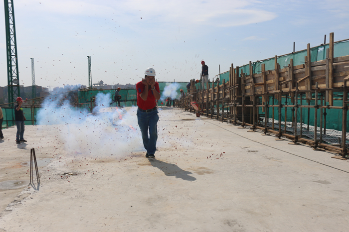 封頂儀式上云南體育運(yùn)動(dòng)職業(yè)技術(shù)學(xué)院院長李錫云及書記陳麟在結(jié)構(gòu)屋面層點(diǎn)燃了鞭炮以祝賀綜合訓(xùn)練館1軸-10軸/L軸屋面斜梁完成了最后一方混凝土的澆筑,這也預(yù)示著項(xiàng)目正式轉(zhuǎn)入二次結(jié)構(gòu)及裝飾裝修施工階段。