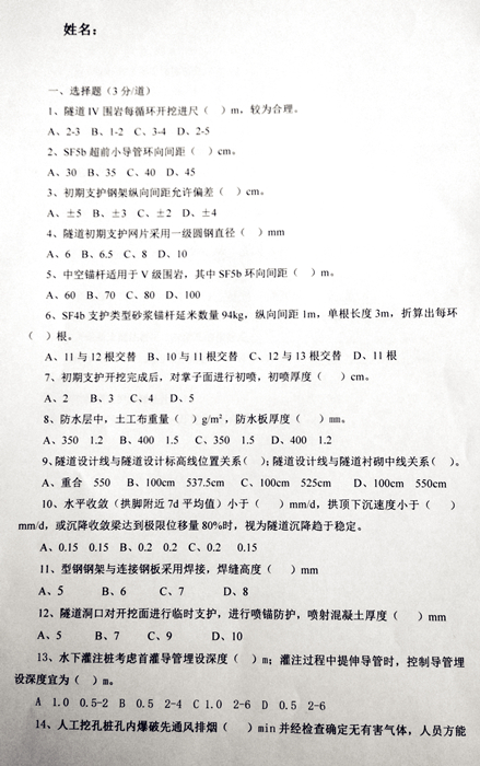 考試針對(duì)施工環(huán)節(jié)中易忽視的問題,重點(diǎn)考察了橋梁、隧道的規(guī)范及施工工藝,并采取圖紙與規(guī)范相結(jié)合的方式梳理了整個(gè)工程項(xiàng)目的施工概況。其中,隧道考察范圍包括:圍巖類型、超前預(yù)報(bào)、支護(hù)、安全、質(zhì)量等;橋梁考察范圍包括:調(diào)拱、調(diào)坡、平整度和壓實(shí)度的控制,特別考核了樁基施工中的主控項(xiàng)目指標(biāo)。