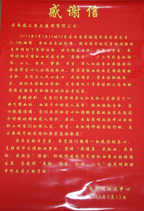 “關(guān)鍵時刻,是您們用深情厚誼和無私大愛譜寫了一曲氣勢如虹,血濃于水的感人篇章……”8月19日,云南昆明血液中心向公司贈送感謝信。