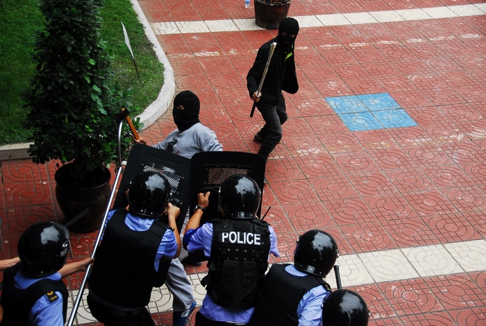“黑林鋪派出所,黑林鋪派出所,五公司受到暴恐襲擊,請火速支援,請火速支援!”8月15日上午10點(diǎn)多,一輛面包車突然沖進(jìn)公司大門,車上跑下來四名手持長刀及斧頭的蒙面“恐怖分子”,公司保衛(wèi)部立即組織職工撤回機(jī)關(guān)辦公樓進(jìn)行防御,并第一時間請求黑林鋪派出所進(jìn)行支援。