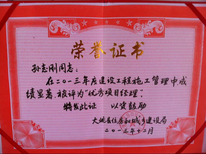 技術(shù)支持: 方森科技 近期,由公司五〇三直管項(xiàng)目部負(fù)責(zé)施工的大姚華豐商業(yè)街建設(shè)項(xiàng)目被大姚縣住房和城鄉(xiāng)建設(shè)局評為“2013年度建筑施工安全質(zhì)量標(biāo)準(zhǔn)化工地”,擔(dān)任此項(xiàng)目的項(xiàng)目經(jīng)理孫志剛同時被授予“優(yōu)秀項(xiàng)目經(jīng)理”稱號。