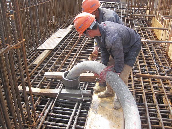 為確保砼澆筑質(zhì)量,所有參建人員提前半個(gè)月進(jìn)行各項(xiàng)施工準(zhǔn)備,項(xiàng)目部提前精心編制施工方案,并邀請(qǐng)專家進(jìn)一步研究優(yōu)化施工方案。在施工過程中,項(xiàng)目部嚴(yán)格控制各道施工程序,嚴(yán)把原材料檢驗(yàn)關(guān)、砼配合比設(shè)計(jì)關(guān)和保養(yǎng)維護(hù)關(guān)。施工中的一大亮點(diǎn)是:創(chuàng)新提出了熱管散熱保溫的方法,該方法具體為待混凝土初凝后鑿?fù)ㄟB接電梯井與集水坑的管道,電梯井蓄水流入集水坑再使用水泵抽至集水坑,出水口水溫控制在25℃左右,使水循環(huán)降低局部混凝土內(nèi)的溫度。對(duì)溫差控制起到較好的促進(jìn)作用。在本次大體積混凝土澆筑過程中,項(xiàng)目部做到了從全方位確保澆筑的順利完成。