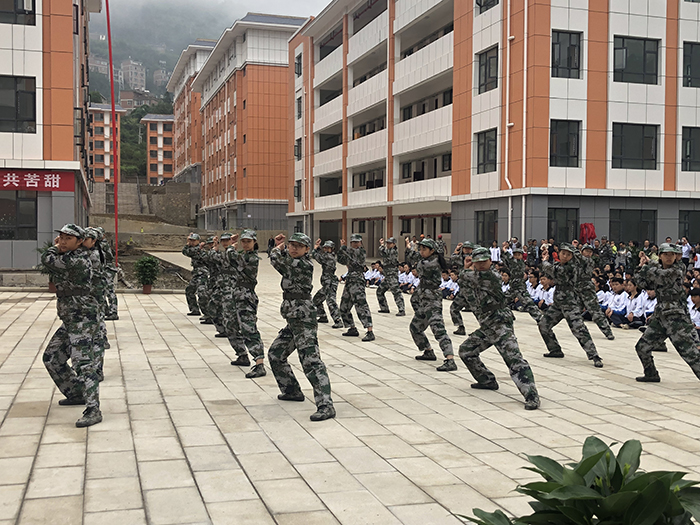 同學(xué)們在平整潔凈的青石地板上進(jìn)行軍訓(xùn)匯報(bào)演出