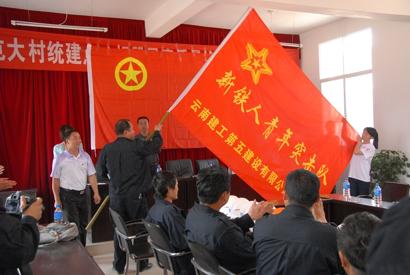 圖為集團公司團委副書記雷棲為項目部青年突擊隊授旗