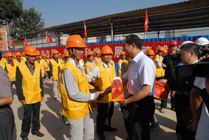 2010年9月19日上午,在中秋節(jié)、國慶節(jié)來臨之際,昆明市總工會(huì)主席戚永宏率市總工會(huì)領(lǐng)導(dǎo)班子一行來到公司直五部施工的昆明市新工人文化宮建設(shè)工地慰問正在施工的公司職工和農(nóng)民工,為他們每人帶去了一盒月餅。戚永宏說:“大家辛苦了,祝大家節(jié)日快樂?!?BR> 五公司副總經(jīng)理李興奎代表施工單位對(duì)他們的到來和關(guān)心表示歡迎和感謝。他說:“多年來,公司創(chuàng)造了5項(xiàng)魯班獎(jiǎng),承建了省內(nèi)多項(xiàng)重點(diǎn)工程、市內(nèi)多項(xiàng)地標(biāo)性建筑。去年,公司簽訂工程合同額30億元,完成施工產(chǎn)值18億元,是各位領(lǐng)導(dǎo)關(guān)心、支持的結(jié)果。按建工集團(tuán)要求,今年公司承接任務(wù)要達(dá)到35億元,完成施工產(chǎn)值25億元,公司將不斷強(qiáng)化質(zhì)量、安全、文明施工管理,參與昆明市“四創(chuàng)兩爭”活動(dòng),支持新昆明的建設(shè),為昆明市的經(jīng)濟(jì)發(fā)展作出應(yīng)有的貢獻(xiàn)。”對(duì)于昆明市新工人文化宮項(xiàng)目,他強(qiáng)調(diào)“公司將與設(shè)計(jì)、監(jiān)理各單位密切配合,盡快掀起施工熱潮,嚴(yán)格管理,精心施工,重合同,講誠信,按期完成施工任務(wù)?!?BR> 戚永宏一行還到施工現(xiàn)場(chǎng)了解項(xiàng)目的具體施工情況,與項(xiàng)目建設(shè)者們親切交談。