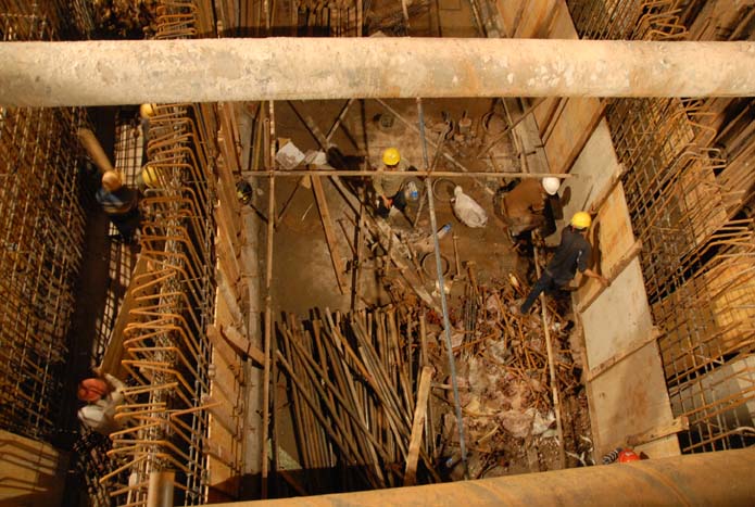 有一段距離施工便道非常近,那天下大雨,劉堅(jiān)剛從監(jiān)理公司辦完事回來(lái),開(kāi)挖機(jī)的跟他說(shuō)挖不到土了。起初,他以為是對(duì)方找借口不想挖土,結(jié)果一細(xì)看,發(fā)現(xiàn)原來(lái)挖機(jī)的位置比路面下沉了近70cm,挖機(jī)確實(shí)無(wú)法下去挖土,即便強(qiáng)行開(kāi)下去挖也非常危險(xiǎn),因?yàn)殇摪鍢兑呀?jīng)整體下沉。他清楚的記得去監(jiān)理公司時(shí)沒(méi)發(fā)現(xiàn)有任何異狀,到回來(lái)發(fā)現(xiàn)險(xiǎn)情,不超過(guò)3個(gè)小時(shí)?!爱?dāng)時(shí),再不采取措施,就可能面臨重新回填、重新打鋼板樁、重新加固、重新挖土。”劉堅(jiān)說(shuō),不但經(jīng)濟(jì)上要損失,工期也要耽誤。于是,他立即安排人用工字鋼打斜撐,經(jīng)過(guò)3個(gè)多小時(shí)的吊、壓、打、焊,終于止住了土體和鋼板樁下沉?!艾F(xiàn)在看來(lái),那天沒(méi)有白費(fèi)力氣,如果當(dāng)時(shí)不及時(shí)采取措施,今天你們看見(jiàn)的就不是現(xiàn)在的樣子(他們正在準(zhǔn)備綁扎側(cè)壁鋼筋),而可能看到的是正在挖土的情景?!彼挠杏嗉碌恼f(shuō)。