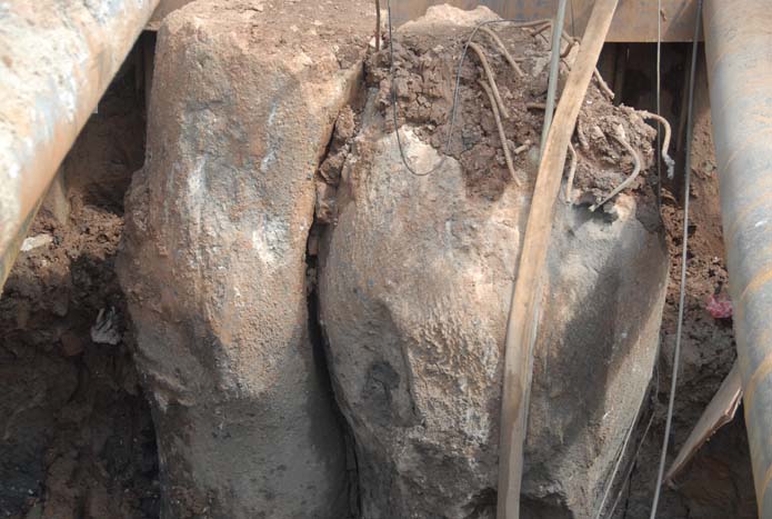 在230多米混凝土支護(hù)樁中,市政直管部施工段僅有40多米,6月9日挖到4m多深時(shí),卻發(fā)現(xiàn)超擴(kuò)徑的支護(hù)樁全分布在這40余米之間。一開(kāi)始計(jì)劃用爆破處理,后來(lái)指揮部不允許爆破,怕爆破振動(dòng)影響周?chē)馏w下沉導(dǎo)致支撐垮塌和周邊民房開(kāi)裂。經(jīng)焦總與相關(guān)單位協(xié)商后,同意改道。沒(méi)辦法,盡管已經(jīng)做了支撐挖了土,只好重新回填,拆除支撐,拔出鋼板樁,又重新放線(xiàn)、重新打鋼板樁、重新焊接支撐、挖土。這樣一來(lái)足足耽誤了8天時(shí)間,本來(lái)還一直催促503直管部盡快施工交接處另一端的,現(xiàn)在反而被他們追著催促,怎么辦?距離要求的時(shí)間也越來(lái)越近,馬慶亮心里著急啊,因?yàn)檫@部分剛好是他在負(fù)責(zé)。