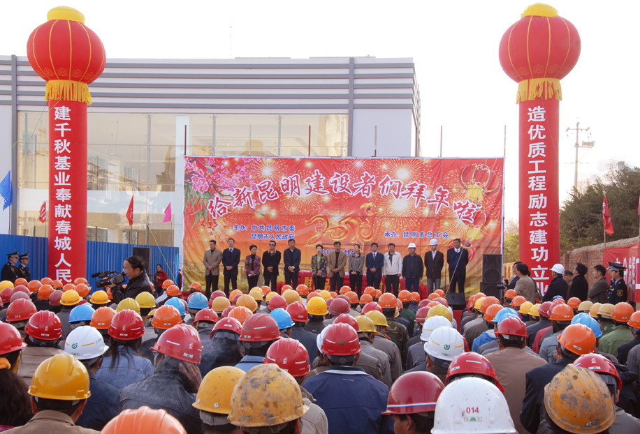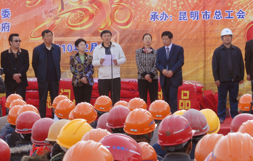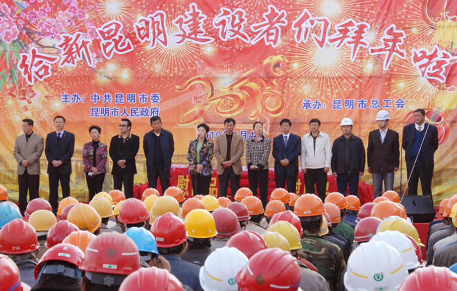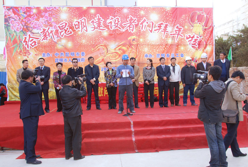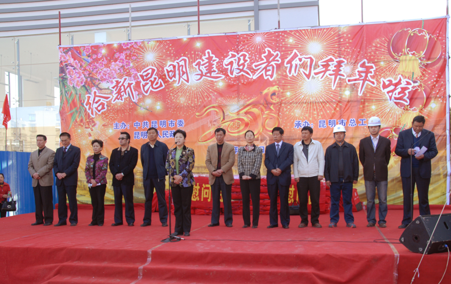 2月4日上午,受昆明市委、市政府委托,昆明市總工會(huì)主席楊麗等領(lǐng)導(dǎo)同志率團(tuán)到云南建工第五建設(shè)有限公司昆明工人文化宮建設(shè)工地,給包括農(nóng)民工在內(nèi)的新昆明建設(shè)者拜年,給建設(shè)者送來(lái)新春的祝福和溫暖的禮品。楊麗主席和工會(huì)干部以及昆明市楓葉職工藝術(shù)團(tuán)的演員們分別獻(xiàn)上精彩的歌舞。