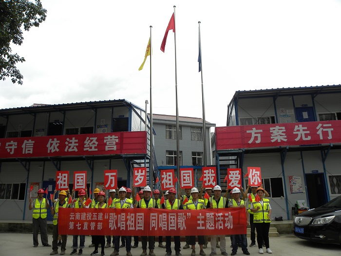 活動先后在直管部、蘭坪縣營盤鎮(zhèn)易遷項(xiàng)目、蘭福公路項(xiàng)目、嶍峨古鎮(zhèn)項(xiàng)目分別進(jìn)行。在項(xiàng)目部以開展集中升國旗儀式,合唱、同唱國歌,快閃等方式,以《義勇軍進(jìn)行曲》《建投之歌》《我和我的祖國》為主唱曲目唱響愛國歌曲。