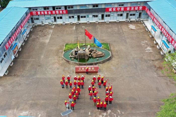 隨著一聲“出旗”口令,升旗儀式正式開始?,F(xiàn)場(chǎng)突然安靜下來(lái),四名穿著紅色工作服,佩戴白色手套的國(guó)旗護(hù)衛(wèi)隊(duì)舉著國(guó)旗踏著整齊的步伐走向旗臺(tái)。待升旗手綁扎好國(guó)旗。“升國(guó)旗,奏國(guó)歌”全體人員整齊的脫下安全帽,伴著《義勇軍進(jìn)行曲》的響起,全體唱國(guó)歌、行注目禮,莊嚴(yán)肅穆。鮮艷的五星紅旗徐徐升起、迎風(fēng)飄揚(yáng)。