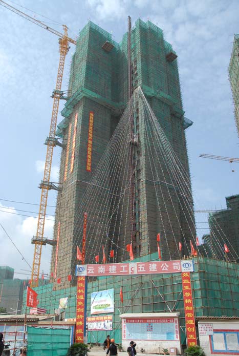由于場地狹窄,起初塔吊、雙籠吊及鋼筋場的布置極為困難。另外,麗水雅苑工程屬于典式住宅,轉(zhuǎn)角較多,外懸挑架在立面立桿和橫桿的設(shè)置過程中也遇到困難。尤其14棟開工比其它棟號晚,地下一層,地上三十三層,又是麗水雅苑最高的四棟高層之一,卻要求與整個項(xiàng)目同時封頂。有壓力才有動力,五建公司始終本著對建設(shè)單位負(fù)責(zé)的原則,充分發(fā)揮面對困難、敢于亮劍的拼搏精神,在工期緊、異型結(jié)構(gòu)難度大的情況下,項(xiàng)目部始終堅(jiān)信辦法總比困難多,找新辦法,克服新困難,工作抓重點(diǎn)、抓難點(diǎn)、發(fā)現(xiàn)問題及時有效落實(shí)到位,努力做到“四要”(即節(jié)奏要快、標(biāo)準(zhǔn)要高、態(tài)度要好、工作要踏實(shí))、“三不”(即工作等不起、慢不得、坐不?。?。通過嚴(yán)格管理和有效的激勵措施,終于迎來了麗水雅苑項(xiàng)目于2010年5月27日勝利封頂,集團(tuán)公司黨委副書記、紀(jì)委書記張戰(zhàn)國親自到場祝賀,參加了封頂儀式,五建公司總經(jīng)理方菊明代表施工單位發(fā)言,公司總工程師焦倫杰等出席了封頂儀式。