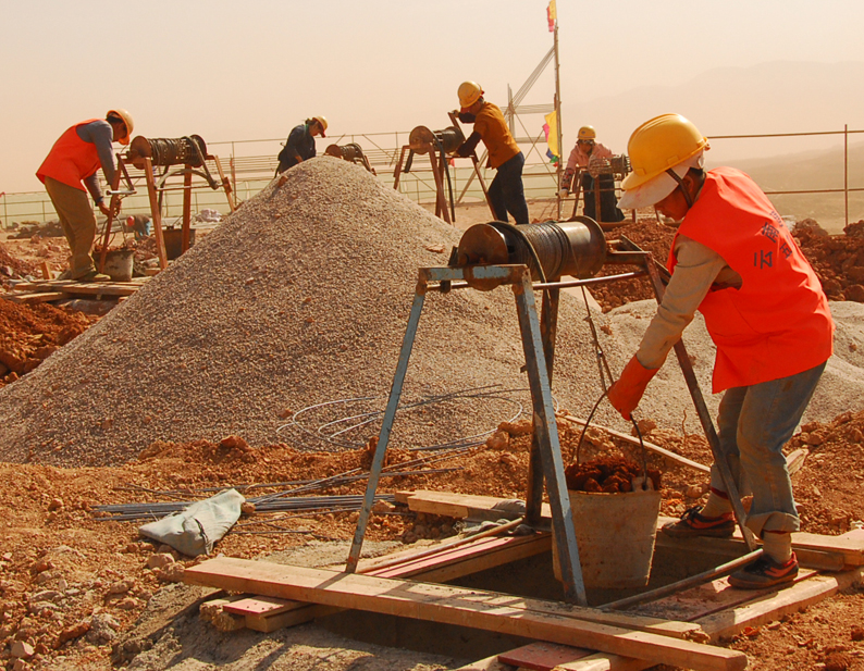 為進一步搞好A2標段的950多棵人工挖孔樁施工,公司組建了由公司直接管理的新機場工程項目部。工地上沒有水,施工用水和生活用水就購買從7-8公里以外拉來的水,項目部在各個施工點搭建了十幾個臨時水池蓄水,以保證施工正常進行;工地上沒有電,為了保證施工用電,工地上自備了多臺柴油發(fā)電機發(fā)電 ;春節(jié)后進入昆明的多風季節(jié),久旱無雨的新機場工地上,到處塵土飛揚。項目部為每一個人購置了口罩,不管工地上氣溫多高,都帶著口罩作業(yè),全體人員天天都灰頭土臉地奮戰(zhàn)在工地上。
