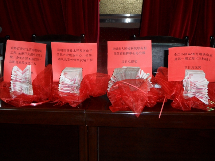第一安裝直管部本次兌現(xiàn)的項目分別是:昆明市人民檢察院職務犯罪偵查指揮中心辦公樓安裝工程,兌現(xiàn)金額172407.03元;金江小區(qū)6#-10#地塊房屋建筑工程第三標段安裝工程,兌現(xiàn)金額70253.63元;金美百貨等改造工程,兌現(xiàn)金額17112.28元;昆明經(jīng)濟技術開發(fā)區(qū)電子信息產(chǎn)業(yè)創(chuàng)業(yè)中心消防、通風及室外管網(wǎng)工程,兌現(xiàn)金額100000元。四個項目在大會上獲得了相應的現(xiàn)金兌現(xiàn)。