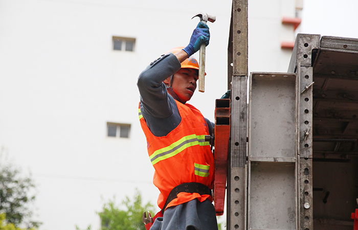 10點20分左右,天空雨水依然連綿,實操比賽正式開始,五組參賽選手同時在實操區(qū)域按照圖紙安裝鋁模,現(xiàn)場撐模板、插螺桿、旋螺母的聲音相互摩擦,叮叮當(dāng)當(dāng)響個不停,瞬間掀起比賽的熱烈氛圍。有小組分工明確,操作熟練,進(jìn)度顯而易見,有小組注重細(xì)節(jié),安裝井然有序,模板牢固平穩(wěn)。在一小時的規(guī)定時間結(jié)束后,裁判人員對安裝完成的模板的質(zhì)量、指導(dǎo)安裝、文明施工等方面進(jìn)行綜合評分,對是否按配模圖紙進(jìn)行還原模板、模板垂直、平整度等進(jìn)行嚴(yán)格打分。隨后,所有參賽選手按要求拆除模板并堆碼材料回原位。