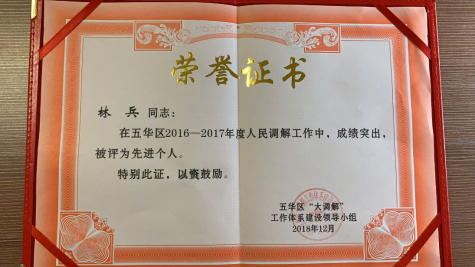 公司法務(wù)清欠部林兵榮獲五華區(qū)2016-2017年度人民調(diào)解工作先進(jìn)個(gè)人稱號(hào)