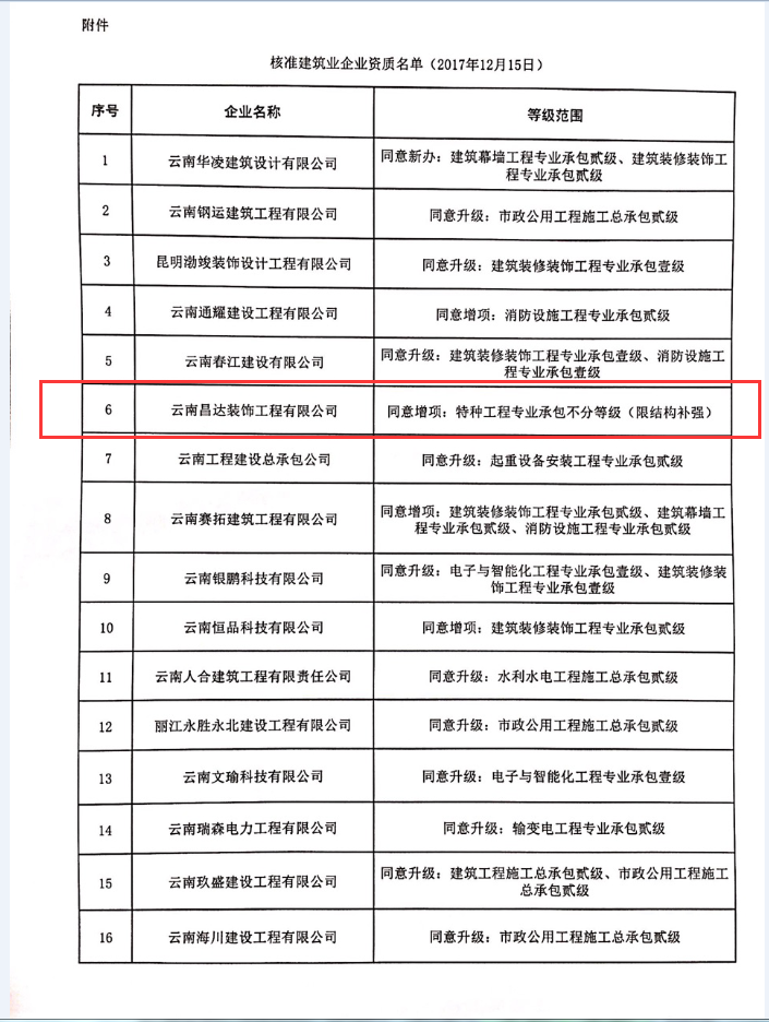 根據(jù)云南省住房和城鄉(xiāng)建設廳12月15日公示,云南昌達裝飾工程有限公司增項特種工程專業(yè)承包不分等級(限結構補強)資質。 此次資質的成功增項,進一步提升了昌達公司的市場競爭力,為昌達今后在特種專業(yè)承包市場領域的開拓和發(fā)展創(chuàng)造了良好的條件。昌達公司將繼續(xù)發(fā)揮優(yōu)勢,組織實力團隊,積極參加有影響力的項目投標,不斷提升昌達業(yè)務水平。 ...