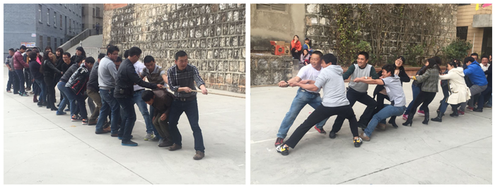 2015年2月13日下午2點(diǎn),隨著拔河比賽裁判員的一聲哨響,五〇六直管項(xiàng)目部迎新春活動(dòng)正式拉開(kāi)帷幕。 由直管部經(jīng)理、書(shū)記帶隊(duì),全體職工組成甲、乙兩支代表隊(duì),比賽過(guò)程中,參賽隊(duì)員努力拼搏。比賽場(chǎng)上,隊(duì)員們口中一起高呼著“一二、一二”, 雙手緊握長(zhǎng)繩,憋足了勁拼命往后拉;比賽場(chǎng)下,圍觀的職工家屬自發(fā)組成啦啦隊(duì)為比賽隊(duì)員吶喊加油...