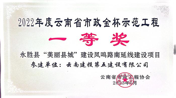 永勝縣“美麗縣城”建設(shè)鳳鳴路南延線建設(shè)項目榮獲2022年度云南省市政金杯示范工程一等獎